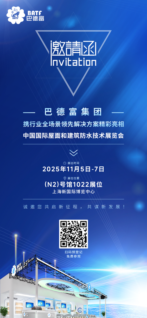 2025中国国际屋面和建筑防水技术展览会将于11月5-7日,在上海新国际博览中心盛大启幕。巴德富集团将携建筑防水领域全场景领先解决方案,精彩亮相N2馆1022展位,诚邀业界同仁、合作伙伴与新老客户共赴盛会!