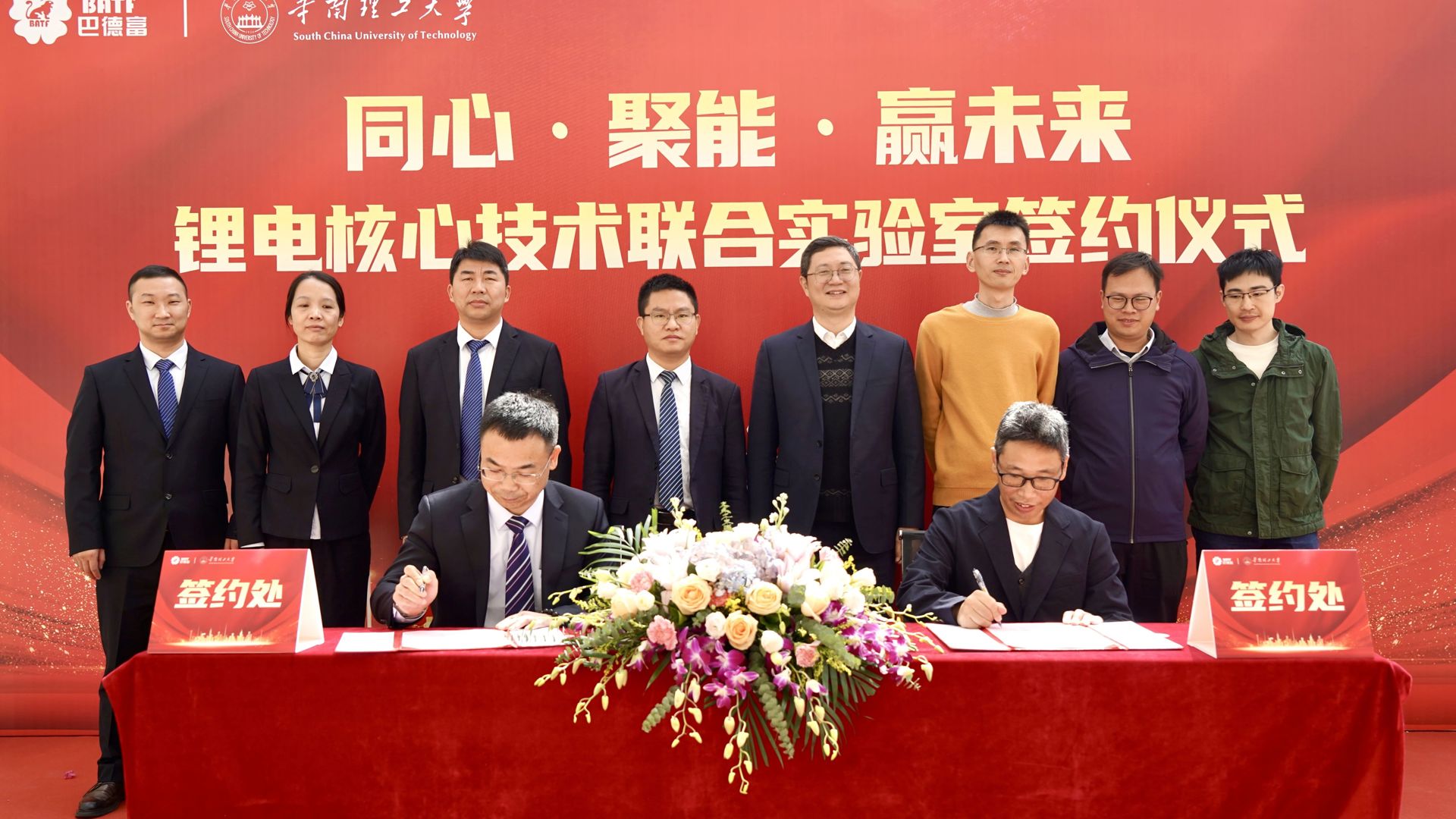 华南理工大学材料科学与工程学院党委书记孟勋、教授王朝阳、巴德富集团CEO龚洋龙、新材料事业部总经理文波等双方代表共同出席仪式。